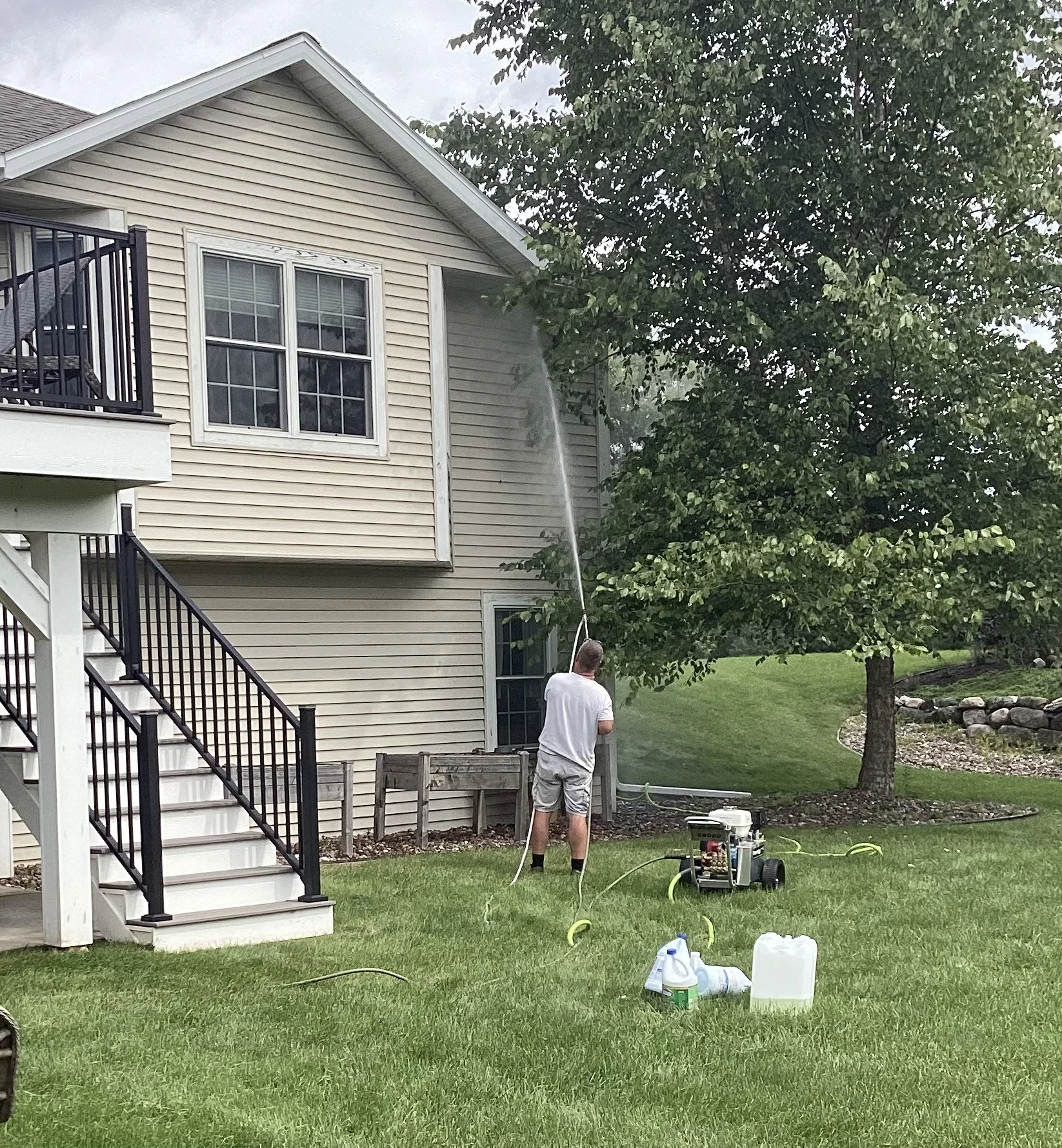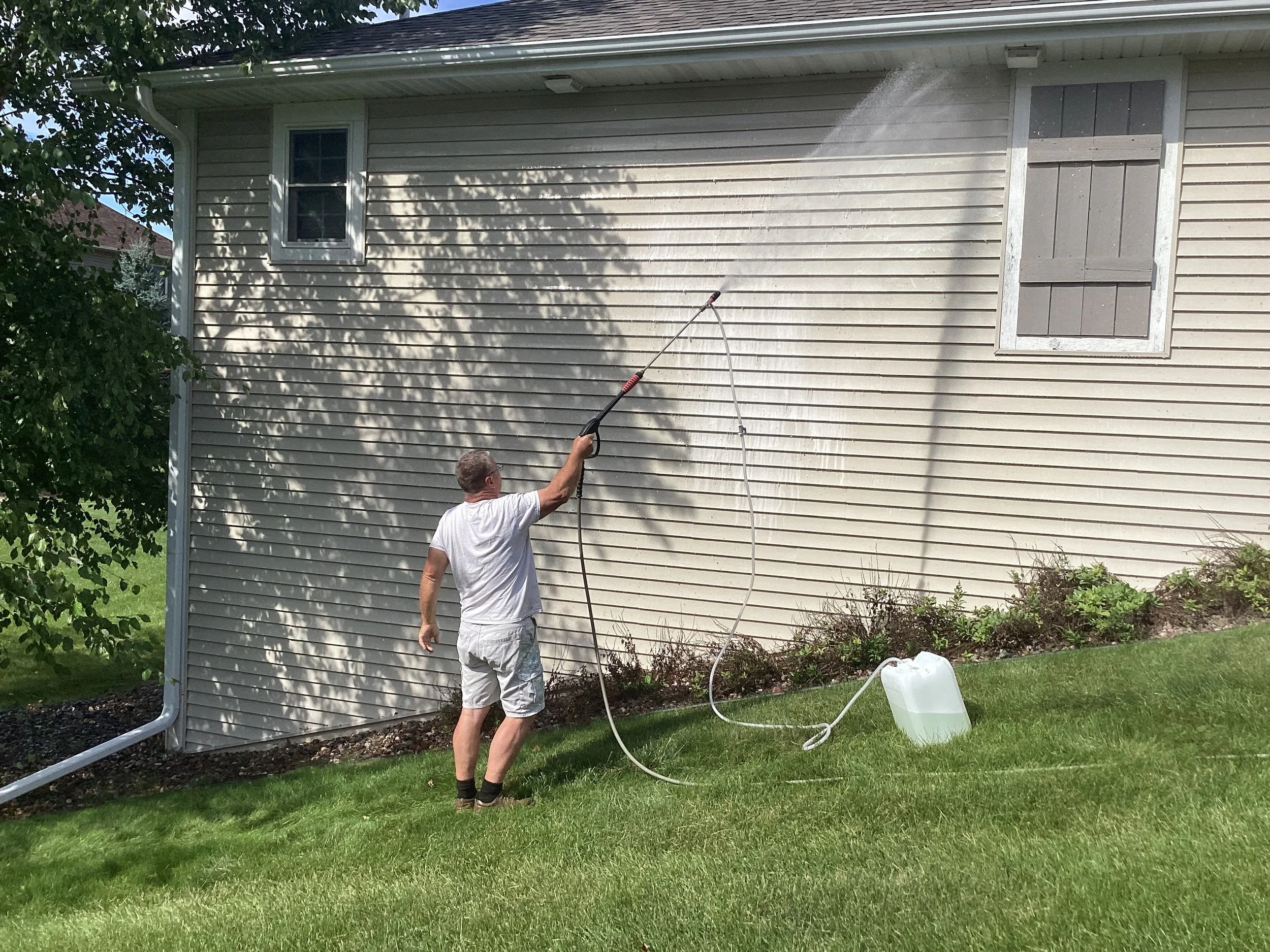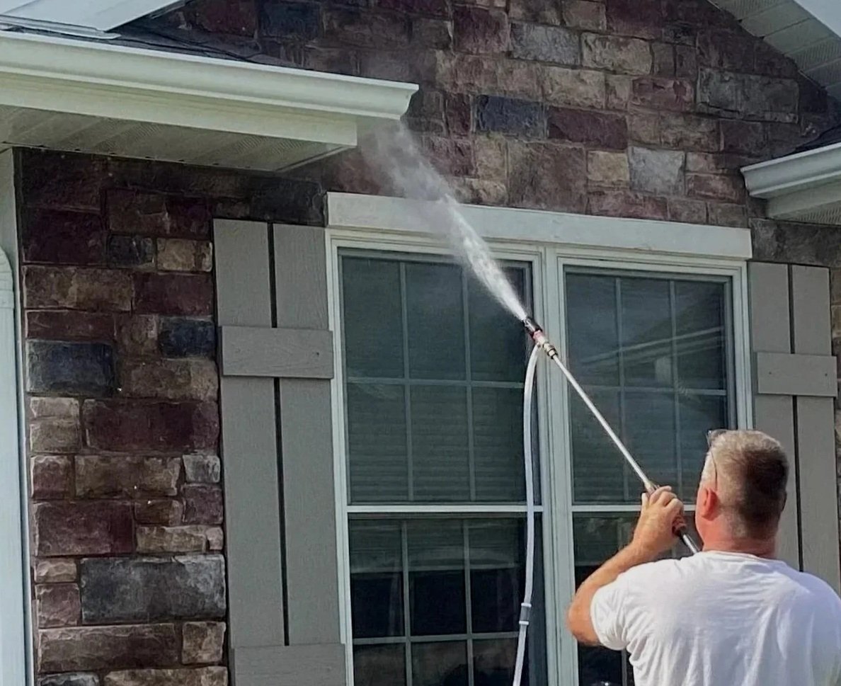 We use soft washing anytime a surface could be harmed by high-pressure cleaning. This method uses low-pressure water, combined with cleaning solutions, to safely remove mold, mildew, algae, and dirt from surfaces like vinyl siding, wood, and most roofs.